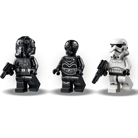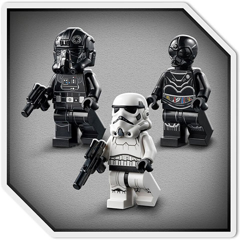 • A csomagban 2 LEGO® Star Wars™ minifigurát találsz: egy TIE vadászpilótát romboló pisztollyal, egy rohamosztagost rombolóval, valamint egy NI-L8 protokoll droid LEGO figurát, a kalandos szerepjátékhoz.