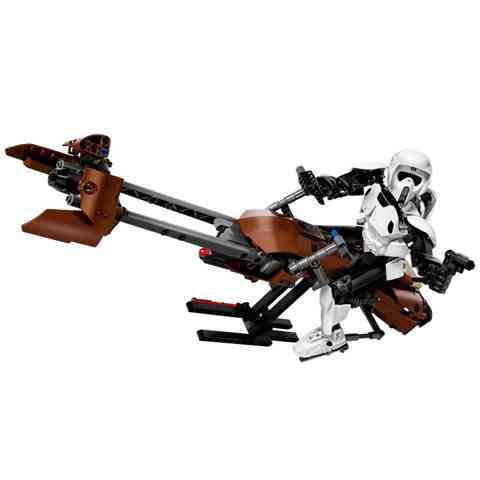 Száguldj távoli bolygók felszínén a bámulatos felderítő rohamosztagossal és járművével! Építsd meg a modelleket, és állítsd be őket! Utána töltsd meg a rugós kilövőt, ragadd meg a kart és száguldj el egy újabb, izgalmas felderítő küldetésre! A felderítő rohamosztagost és a motorját láthattuk a Jedi visszatér című filmen, ahogy az Endor bolygó hatalmas erdőségében száguldoztak a fák között és hatékonyan vették fel a harcot a lázadó seregek kommandósaival, de vigyázz, az ewokok nehogy meglepjenek egy kifeszített kötéllel!