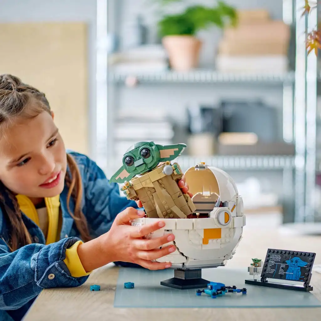 • Grogu LEGO® figura – A megépíthető, fő játékmodellhez egy állványon álló Grogu-adattábla is tartozik, amelyen helyet kap a standard méretű, megépíthető kis bölcsőben ülő Grogu LEGO figura