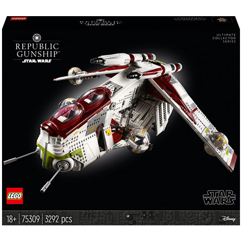 Idézd fel a Star Wars: A klónok háborúja című sorozat fantasztikus geonosisi csatáját egy Köztársasági hadihajó (75309) megépíthető és kiállítható Ultimate Collector sorozat modelljével. Az alacsonyan repülő harci-szállító (LAAT) jármű eredeti részletei gyönyörűen visszaköszönnek LEGO® kockák formájában, ilyenek például a pilótafülkék, a kihajtható, gömbölyű ágyútornyok, a tetején 2 ágyúval, a szuper hosszú szárnyak, a nyitható oldalak, a hátsó fedélzeti nyílás és a beltéri részletek.