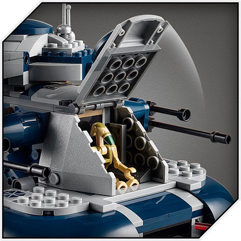 • Az AAT építőjáték rengeteg klassz funkciót tartalmaz, amelyek mind játékcsatára inspirálnak. Ilyen többek között a 2 rugós kilövő, egy felemelhető ágyúval ellátott, forgó lövegtorony, valamint a nyitható első és toronybeli fedélzeti nyílások, ahol elhelyezheted a harci droidokat.
