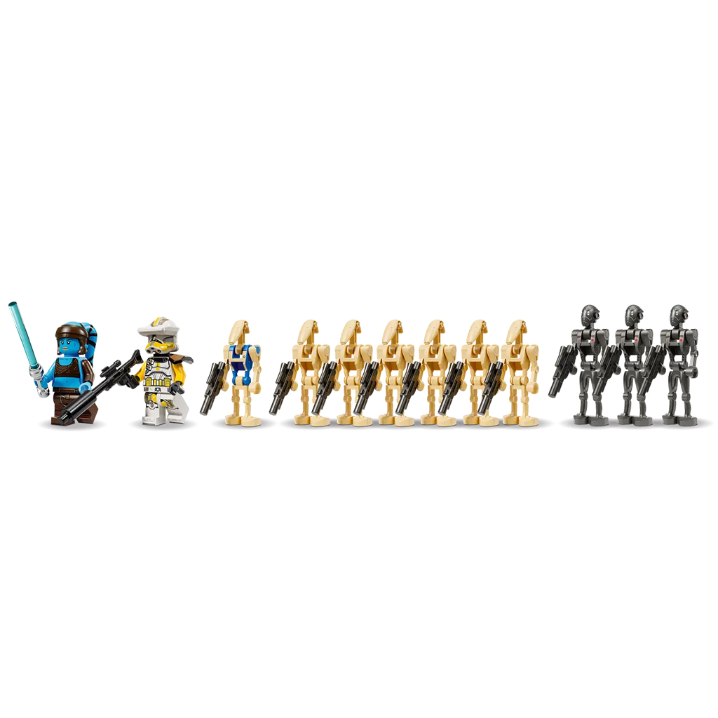 Ez a szett, ami egy vagány Star Wars ajándék a gyerekeknek, 2 LEGO® minifigurát is tartalmaz: Aayla Secura fénykarddal és Bly parancsnok sugárvető karabéllyal. A szett része még 3 kommandós droid és 6 harci droid LEGO figura, mind sugárvetőkkel felfegyverezve, valamint egy pilóta harci droid LEGO figura is. A készlet 976 elemből áll.