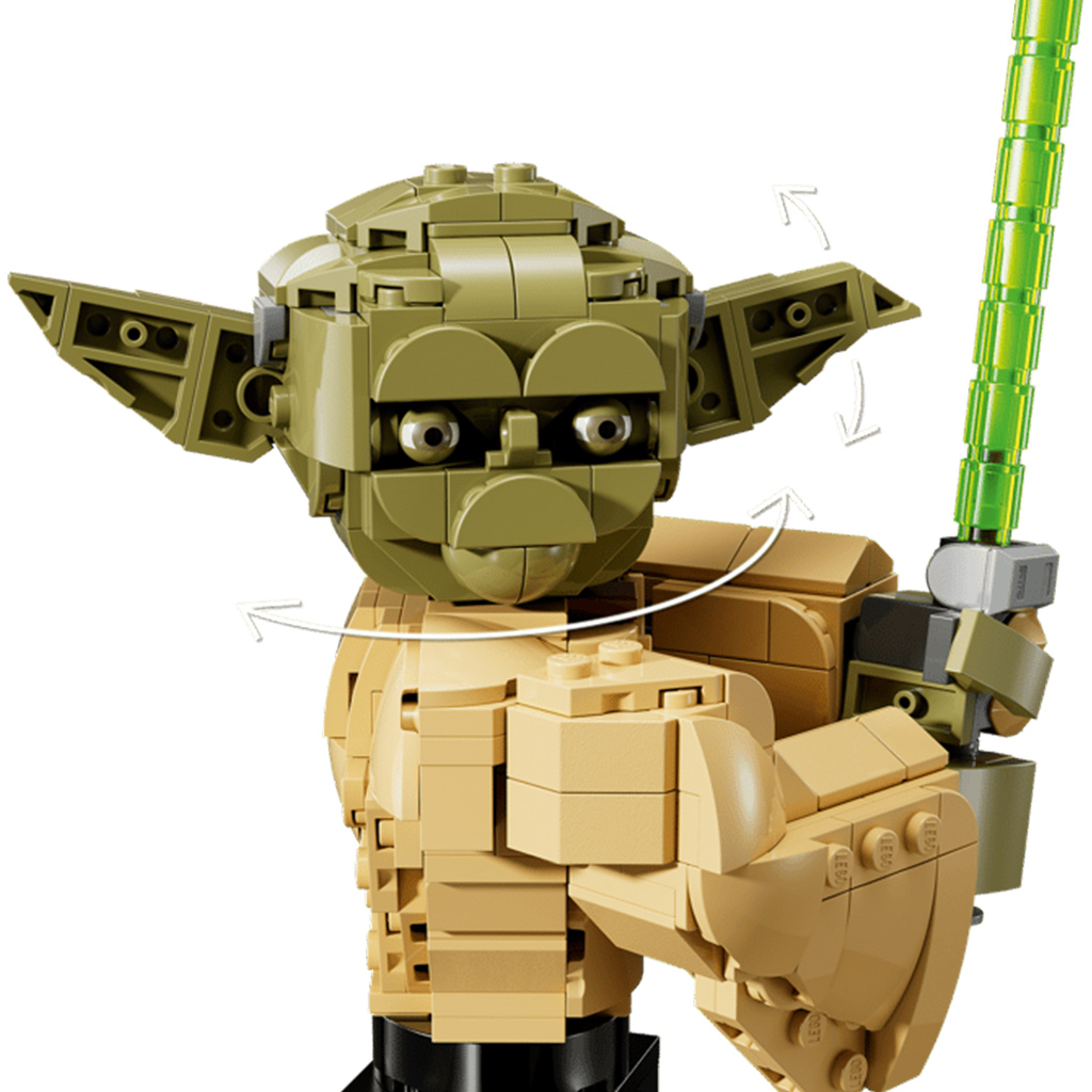 •KIÁLLÍTÁSRA KÉSZÜLT – Helyezd alkotásod a (névtáblával ellátott) megépíthető állványra, a Yoda LEGO® Star Wars™ minifigura mellé, és forgasd el a mellszobrot az állványon, hogy minden szögből megnézhesd!