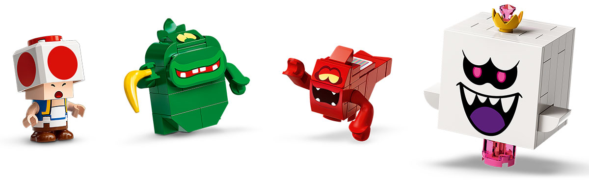 • 4 Super Mario™ Luigi‘ Mansion™ szereplők – Toad (ijedt arckifejezéssel), egy Kukás szellem, egy Markoló szellem és King Boo LEGO® figurát tartalmaz, plusz más zenét triggerelő kezdőlemezt