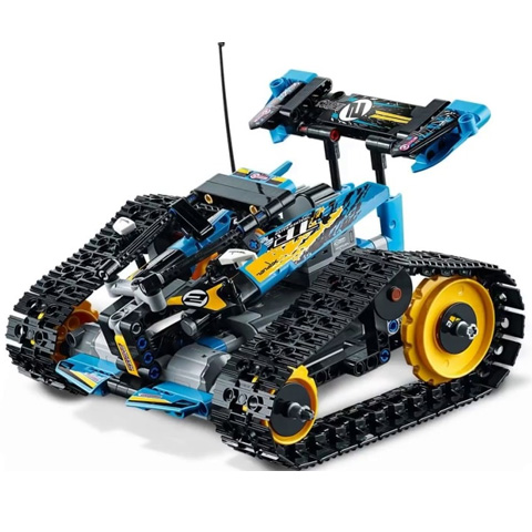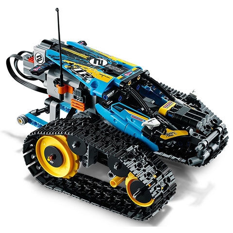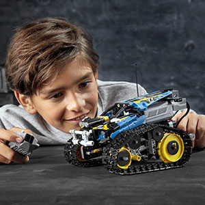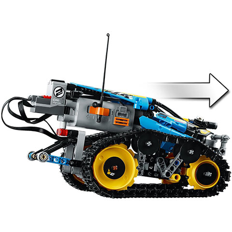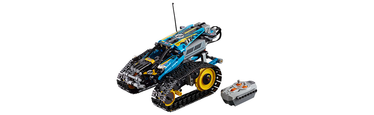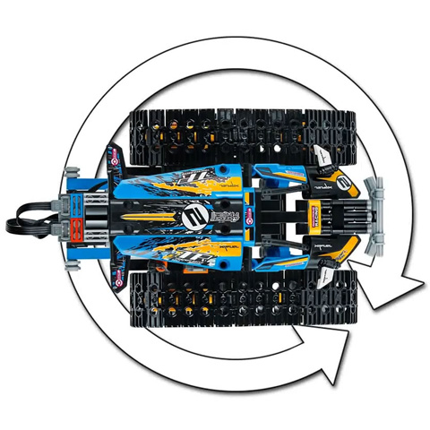 A LEGO Technic Távirányítású kaszkadőr versenyautót futurisztikus kialakítás jellemez. Hatalmas, talajhoz tapadó lánctalppal és nagy hátsó lánckerékkel lett felszerelve, aminek köszönhetően a gyorsulás nem ismer határokat! Ragadd meg a távirányítót és taposs a gázra, hogy vagány egykerekes trükköket, forgásokat és éles kanyarokat mutass be előre- vagy hátramenetben, és ugrass át az akadályokon is! A kocsi két oldalán lévő lánctalpak külön külön vezérelhetők, így az egyiket előre, a másikat pedig hátra felé hajtva, lehetőség van arra, hogy a kocsi egyhelyben megforduljon.