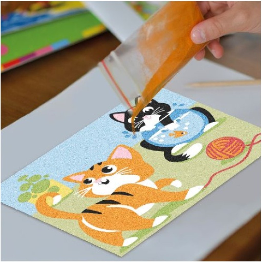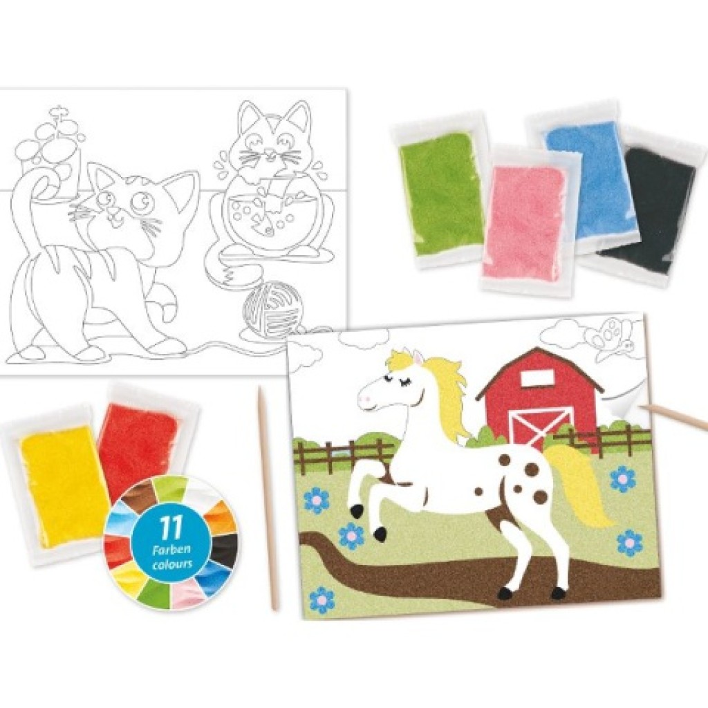 A homokfestés egy igazán különleges és szórakoztató kreatív tevékenység, melyet most a gyerekek is kipróbálhatnak otthon. Ebben a szettben megtalálhatóak az állatokat ábrázoló öntapadós felülettel ellátott táblák, melyeknek a különböző részeire szórva a különböző színű homoktasakokat, egy igazán színpompás és látványos alkotás rajzolódik majd ki. A szett tartalmazza a részletes, színes útmutatót is, melyet követve könnyű dolguk lesz a kicsiknek és a kész mű akár a szobájuk falát is díszítheti majd.