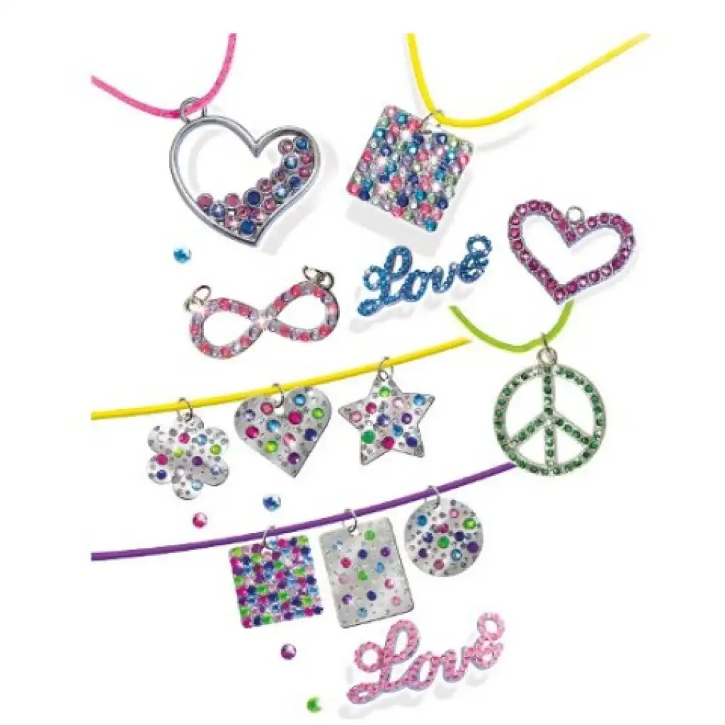 Aki egyedi és látványos ékszereket szeretne készíteni, annak ez a különleges szett biztosan elnyeri majd a tetszését. A csomagban a fém medálok mellett megtalálható a 850db színpompás strasszkő, melyeket tetszés szerint lehet majd felhasználni, hogy különleges alkotások születhessenek. A csomagban minden benne van, amire a munka során a gyerekeknek szükségük lehet, így a ragasztó és még a kész ékszerek tárolására szolgáló, fa formájú is állvány is.