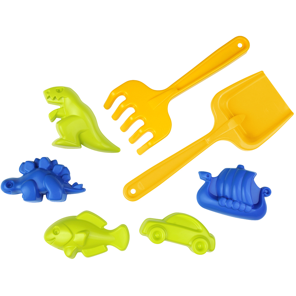 7 részes szett: lapát, gereblye és 5 homokozóforma