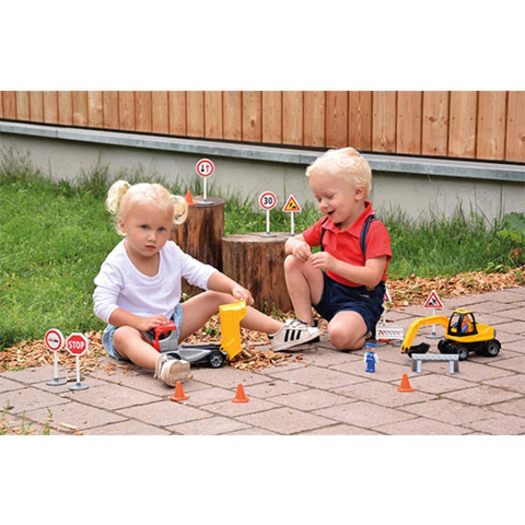 Ez a szuper játékszett hatalmas segítséget fog jelenteni az útfelújítások területén, hiszen a masszív kerekeivel bármilyen tereppel megbirkózik, és a körbefordítható fülke pedig lehetővé teszi, hogy kényelmesen tudjon dolgozni maga körül. A gépkezelő könnyedén a helyére szállhat, hiszen a vezetőfülke felnyitható, ráadásul a markolókanál is pont úgy mozgatható, mint az igazi markológépnél. A dömper szintén lenyitható vezetőfülkével, valamint billenthető raktérrel rendelkezik. A csomagban két figura és megannyi jelzőtábla és terelőbója található. A LENA Spiel Gut tanúsítványa biztosíték ként szolgál a kiváló minőségű alapanyagok és a strapabíró kialakítás terén épp úgy, mint ahogy a gyerekek szempontjából legfontosabban számító játékélmény szempontjából.