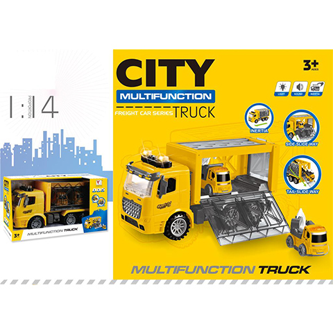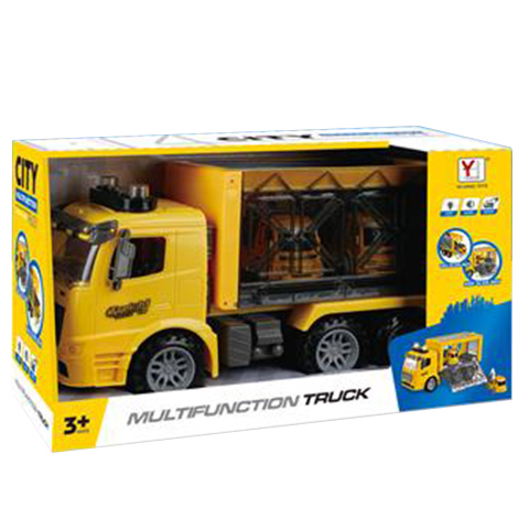 Szerezz be egy különleges, sárga színű kamiont amely munkagépeket szállít és nagy hasznát veheti gyermeked saját játékbirodalmában, hiszen a különböző munkagépeket és az építkezéshez való további dolgokat egy szempillantás alatt a helyszínre szállíthatja segítségével. A kamion kompatibilis bármely más, 1/64-es méretű kisautóval, így akár a már meglévő járgányok is szállíthatók benne. A kamion fény és hang effektekkel egyaránt rendelkezik amelyekkel még magasabb szintre emelheti a játékélményt. Lendkerekes meghajtásának köszönhetően egy kisebb lökés hatására is nagy távolságot tud megtenni.