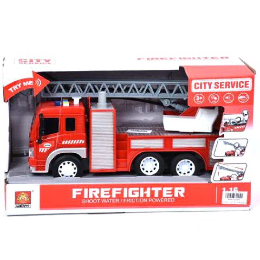Ha gyermekünk rajong a tűzoltókocsikért, akkor ez az élethűen kidolgozott 1/16-os méretarányú modell biztosan elnyeri majd a tetszését. A tűzoltó autó mozgatható létrával rendelkezik, melyt forgatni is lehet. A még jobb játékélmény érdekében az autó tetején gombok találhatóak, melyeket megnyomva az fény- és hangeffektekkel szórakoztatja majd a gyerekeket. Az autó szabadon futó kerekekkel van ellátva. Kialakításának köszönhetően robusztus és strapabíró.