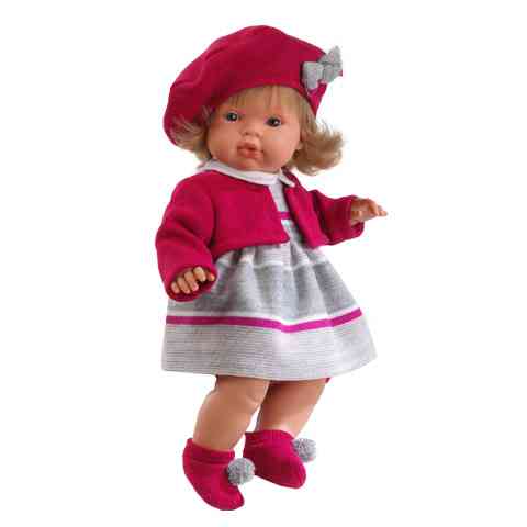 A kislányok álma lehet ez a masnis, piros svájcisapkás csodaszép lány baba, mely ruhájának csíkos mintázata, kerekített gallérja, sapkájával harmonizáló színű kardigánja, és ugyan ilyen színű, pom-pommal díszített zoknija feledhetetlen küllemet kölcsönöz neki. A baba műanyag részei gyermekbarát, puha műanyagból készültek, teste pedig textilből. A test tartalmazza az elemekkel ellátott síró szerkezetet. A baba akkor hagyja abba a sírást, ha a cumit a szájába helyezik. Ez a baba kiváló választás, akár ajándéknak is, minden gyermek számára.