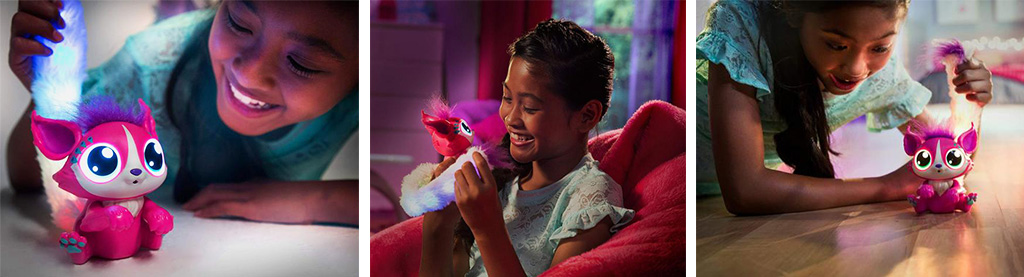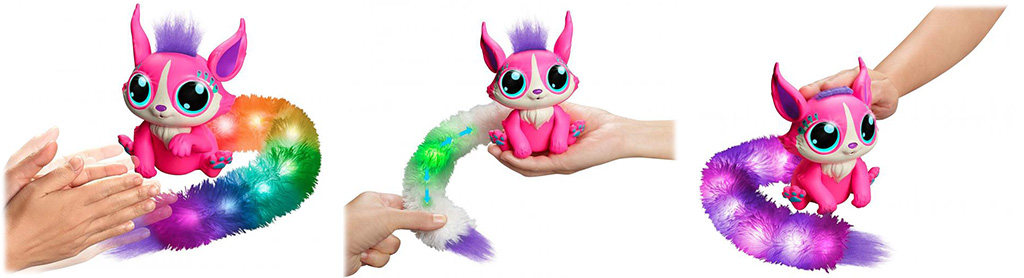 Ismerkedj meg a Lil'Gleemerz kisállatkákkal, akik nem olyanok, mint az átlagos plüss figurák. Amellett, hogy szivárványos és nagyon vidám megjelenésűek, hatalmas nagy szemekkel - aminek biztosan nem tudsz majd ellenállni - és fülekkel rendelkezik, ráadásul még interaktívak is. Az állatka összesen három színben lesz elérhető, ami rózsaszín, kék és lila. Ha pedig nem tudsz dönteni melyik legyen a választott, szerezd be mindet, és még nagyobb lesz a móka, hiszen egyszerre is tudsz velük játszani. Kiválaszthatod, hogy melyik tetszik a legjobban, és már kezdődhet is a játék. Az interaktív plüss nagyon különleges, hiszen aranyos megjelenése mellett még ráadásul hosszú, plüss farkában apró és színes LED lámpák világítanak. Ezek a lámpák (attól függően, hogy éppen milyen kedve van) változnak és ez alapján tudni fogod, hogy ölelésre van szüksége, vagy épp egy kis játékra. Ha játszani kezdesz vele, különböző fényekben kezd el villogni, és még a fülét is tudja mozgatni.
