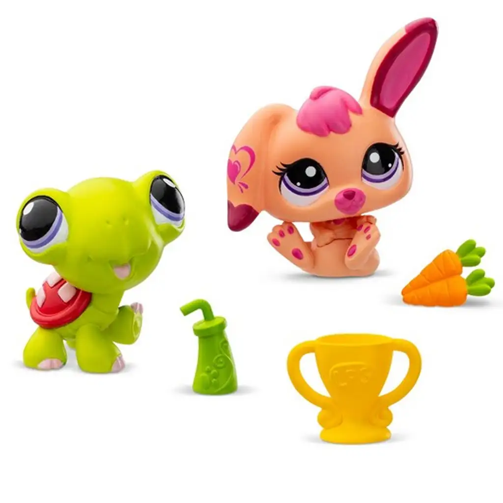 A csomagban található kiegészítők, például a sárga trófea, a zöld vizespalack és a kis sárgarépa, tovább színesítik a játékot. A teknős és a nyuszi élénk színei és aranyos, részletgazdag kidolgozása garantáltan elbűvöli a gyerekeket, és órákon át leköti őket. A mellékelt kártya és virtuális kód további játékélményt kínál, lehetővé téve, hogy a gyerekek online is felfedezzék a Littlest Pet Shop világát.