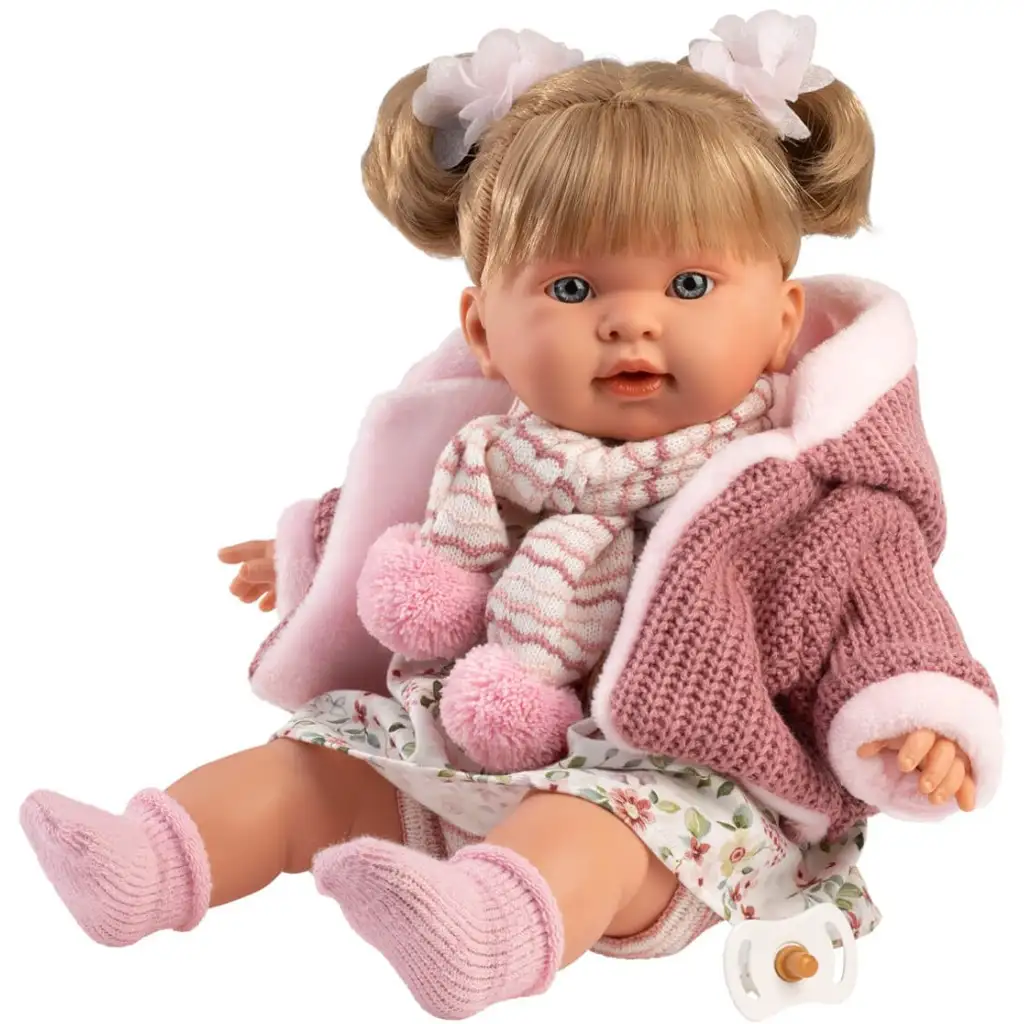 Fedezd fel a Llorens Alexandra babát, aki minden kislány legjobb barátnője lehet! Ez a 42 cm-es síró baba nemcsak elbűvölő megjelenésével, hanem élethű funkcióival is lenyűgözi a gyerekeket. Alexandra egy bájos, puha tapintású rózsaszín kötött kabátot visel, alatta egy vidám, virágmintás ruhácskával, mely tökéletesen illik a tavaszi-őszi játékhoz. A kötött sálon található nagy, bolyhos pomponok aranyos kiegészítők, melyek játék közben is sok-sok mosolyt csalnak elő.