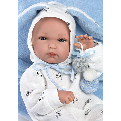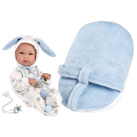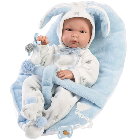Llorens: Bimbo 35cm-es újszülött fiú baba kék hordozóval
