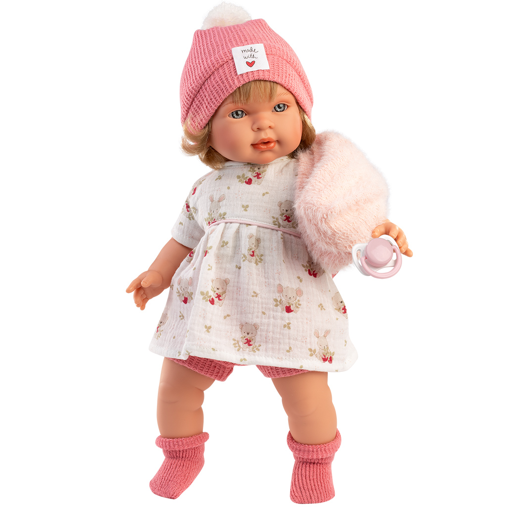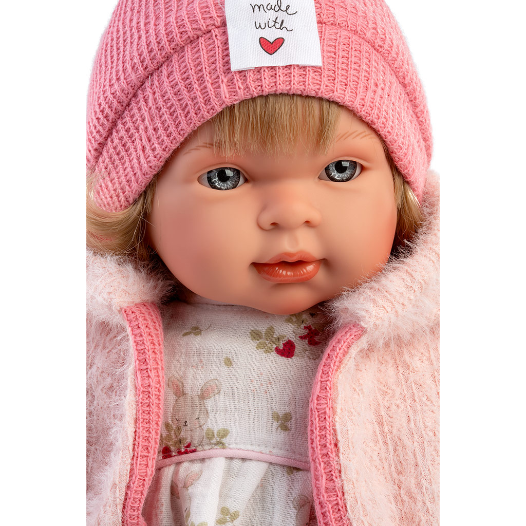 Llorens: Carla 42cm-es síró baba cumival szívecskés sapkában
