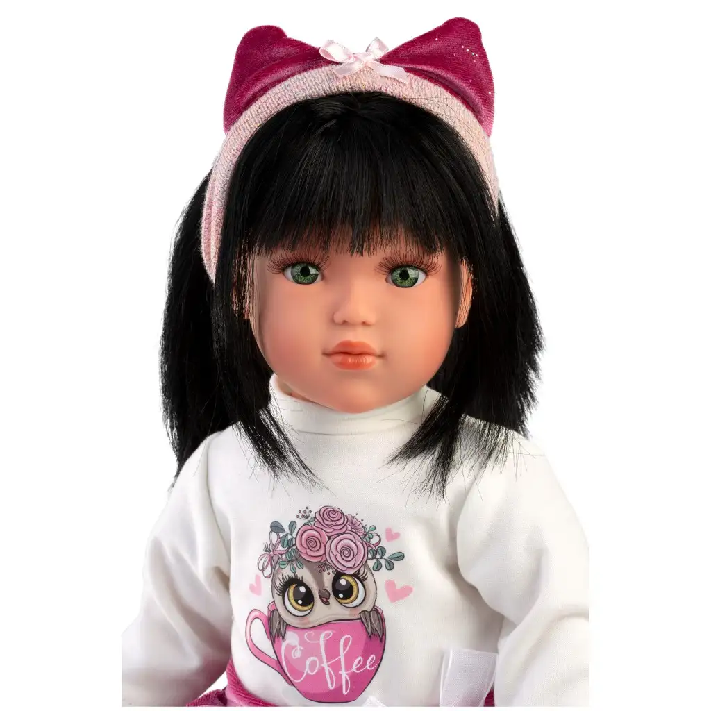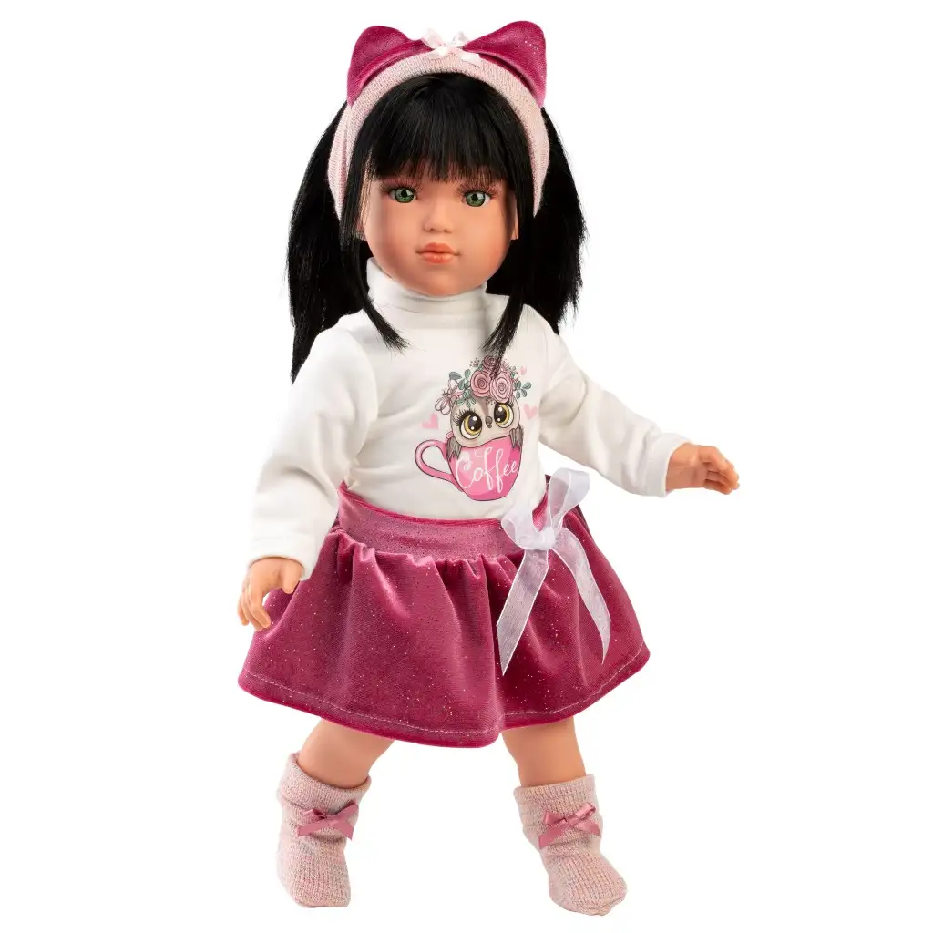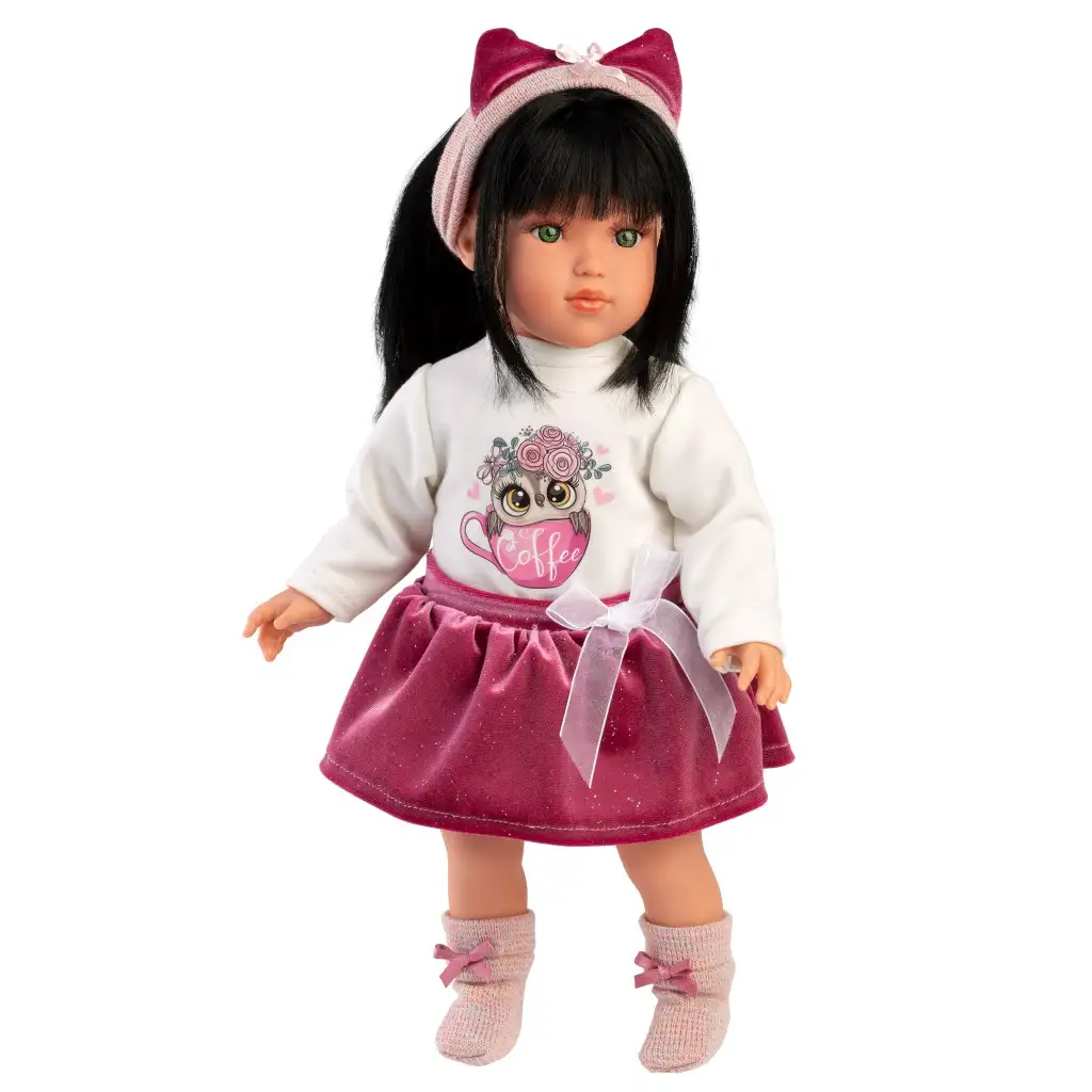 Találkozz Grétával, a Llorens 40 cm-es babájával, aki magával ragadó egyéniségével azonnal belopja magát a gyermeked szívébe! Gréta élethű megjelenése és megnyerő zöld szemei mellett egy stílusos bagoly mintás felsőt és csillogó rózsaszín szoknyát visel, ami mindig trendi választás a babák világában. A kiegészítők, mint a szalagos hajpánt és a cuki, csillogó cipők, tovább fokozzák elegáns megjelenését. Gréta hosszú, selymes fekete haja pedig bármilyen frizura elkészítésére alkalmas, így a gyerekek órákat tölthetnek el a kreatív és divatos hajrendezéssel. A Llorens prémium minőségű spanyol babák mindegyike kézzel készített, kiemelkedően részletgazdag kidolgozással bír és gondosan kiválasztott alapanyagok felhasználásával készül, hogy a legmagasabb minőségi követelményeknek is megfeleljen. A baba egy csodaszép díszdobozban érkezik, így gyerekeknek és gyűjtőknek egyaránt tökéletes választás.