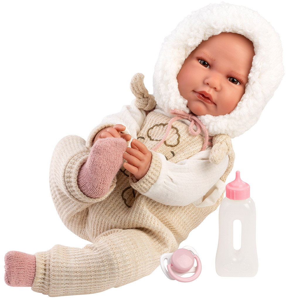 A Llorens: Luis 45 cm-es síró baba tökéletes választás, ha egy igazán élethű és szerethető játékbabát keresel gyermeked számára. A baba puha, kötött hatású rugdalózót visel, amelyet egy aranyos bárányos minta díszít, és egy meleg, bundás kapucni egészít ki, ami különösen bájossá teszi a megjelenését. A finom, pasztell színek és a részletgazdag kidolgozás még valósághűbbé varázsolják. A síró funkció segítségével a baba cumival könnyen megnyugtatható, így gyermeked játék közben megtapasztalhatja a gondoskodás élményét. A cumisüveg és cumi további szerepjáték lehetőségeket kínál.