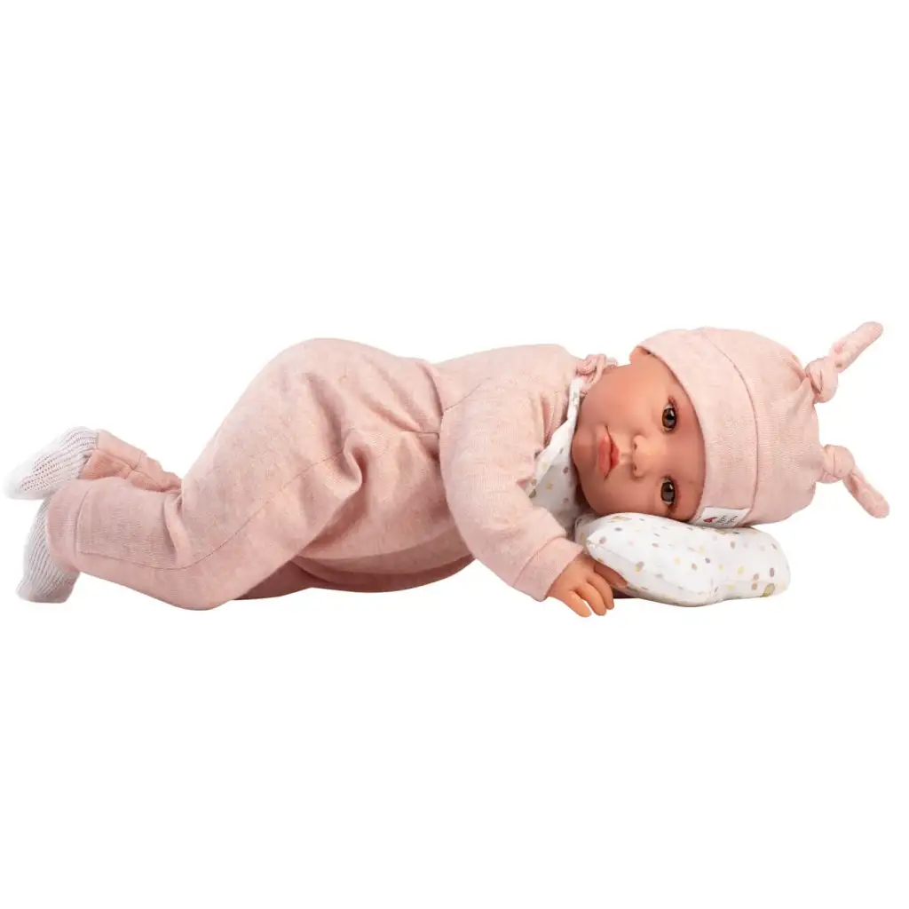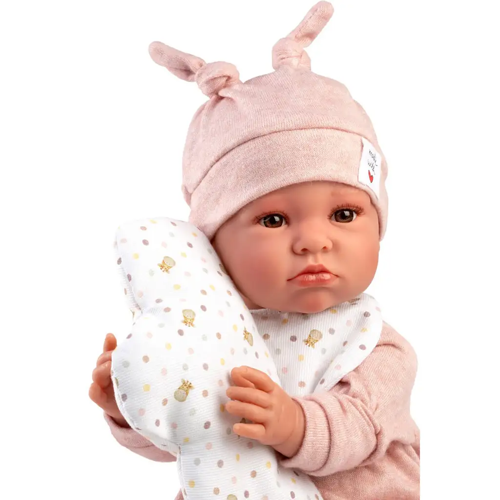 A baba öltözete puha, világos rózsaszín rugdalózó, hozzá illő aranyos nyuszifüles sapkával, ami igazán különlegessé és játékossá teszi Lunát. Nyakában pöttyös előkét visel, az ölében pedig egy színben harmonizáló, felhő alakú párnát tart – ez a párna nemcsak dekoratív, hanem a szerepjátékhoz is praktikus kiegészítő. A párnán található kis pompon még kedvesebbé varázsolja az összhatást.