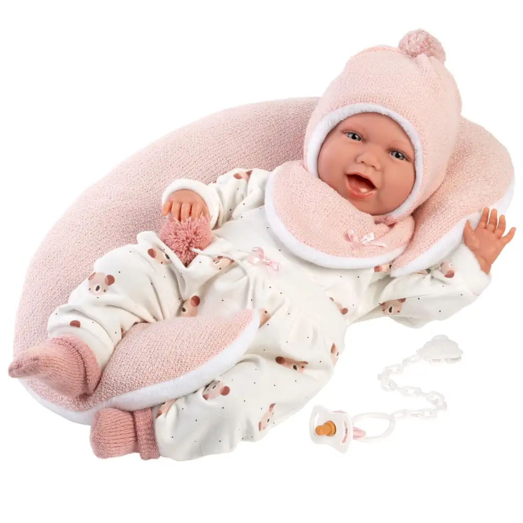 Llorens: Mimi 42cm-es baba hanggal, pocak párnával macis ruhában