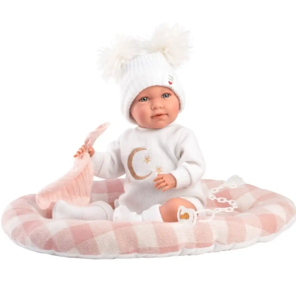 Llorens: Mimi Llorana 42cm-es síró újszülött baba kockás ággyal