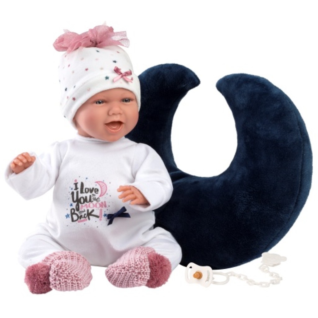 Llorens: Mimi Sonrisas 42cm-es kacagó újszülött baba hold alakú párnávalLlorens: Mimi Sonrisas 42cm-es kacagó újszülött baba hold alakú párnával