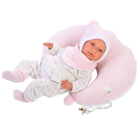 Llorens: Mimi újszülött nevető lány baba holdacska alakú párnával 42cm