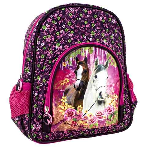 Akár iskolába is elviheted magaddal kedvenc paripáidat ezentúl, hiszen ezen a dekoratív lovas iskolatáskán két ló is feltűnik. A lila és pink színű, virágos apró mintával dekorált iskolatáska egy nagy rekesszel rendelkezik, valamint elején egy lovas mintával díszített cipzáras zseb található. Oldalain hálós kulacstartó zsebet találsz, melyekben kedvenc italodat viheted magaddal. Állítsd be a vállpántokat megfelelő hosszúságúra, és máris indulhatsz a suliba a lovas iskolatáskával!