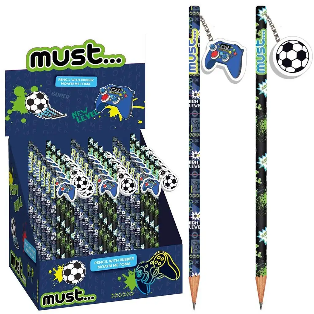 A ceruzák ergonomikus kialakítása kényelmes és stabil fogást biztosít, így a gyerekek hosszabb ideig is kényelmesen írhatnak velük. Az egyik változat fekete alapon futball labdás mintával, míg a másik fekete alapon videojáték kontrollert ábrázoló mintával rendelkezik. Mindkét változat tartalmaz egy aranyos függő radírt a ceruza végén, így a hibák azonnal és könnyedén kijavíthatók.