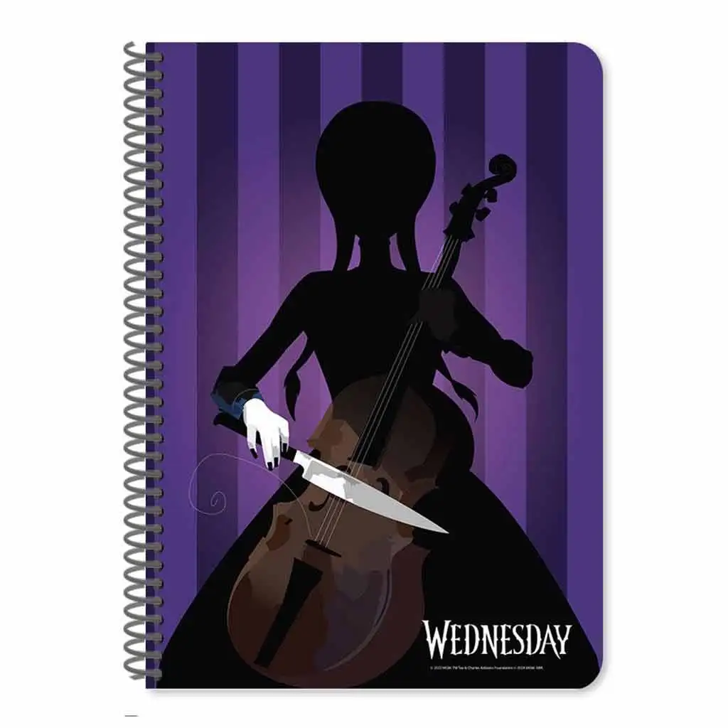 Varázsold el a jegyzetelést ezzel a Luna Wednesday vonalas spirálfüzettel! Az A/4-es méretű, 60 oldalas füzet két különleges dizájnban érhető el, amelyek a népszerű Wednesday Addams karakter világát idézik meg. Az egyik borítón Wednesday hegedülés közben látható, ahol a hegedűvonó helyett egy kést tart, a másik borítón pedig a jól ismert copfos sziluettje tűnik fel. Mindkét dizájn sötét és misztikus hangulatot áraszt, tökéletes választás minden Addams Family rajongónak.
