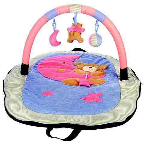A babák ezen a pihe-puha játszószőnyegen pihenhetnek, melynek különlegessége, hogy a fejük felett átívelő elemen plüssjátékok függenek. A rózsaszín rúdon macit, labdát és gy csillagot is megpillanthatnak, ami azonnal felkelti az érdeklődésüket. A Holdon pihenő maci figura a játszószőnyeg mintáján is feltűnik, ezen pihenhetnek a kicsik.