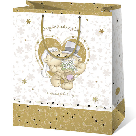 Egy esküvőre nem illik üres kézzel beállítani, ugyanakkor a csomagolással járó vesződség nagy részét meg lehet spórolni, ha a nászajándékot egy ilyen aranyos dísztasakban adjuk át. A fehér és arany színek remekül illenek az alkalomhoz az aranyos, mackós minta pedig kedvességet sugároz. A közepes méretű, álló kialakítású ajándéktáska kiváló minőségű, telített színekkel készített nyomata szép megjelenést, míg a lakkozott vastag papír és az erős zsinórfüles kialakítás tartósságot kölcsönöz neki, hogy a benne lévő ajándékok biztonságban legyenek.