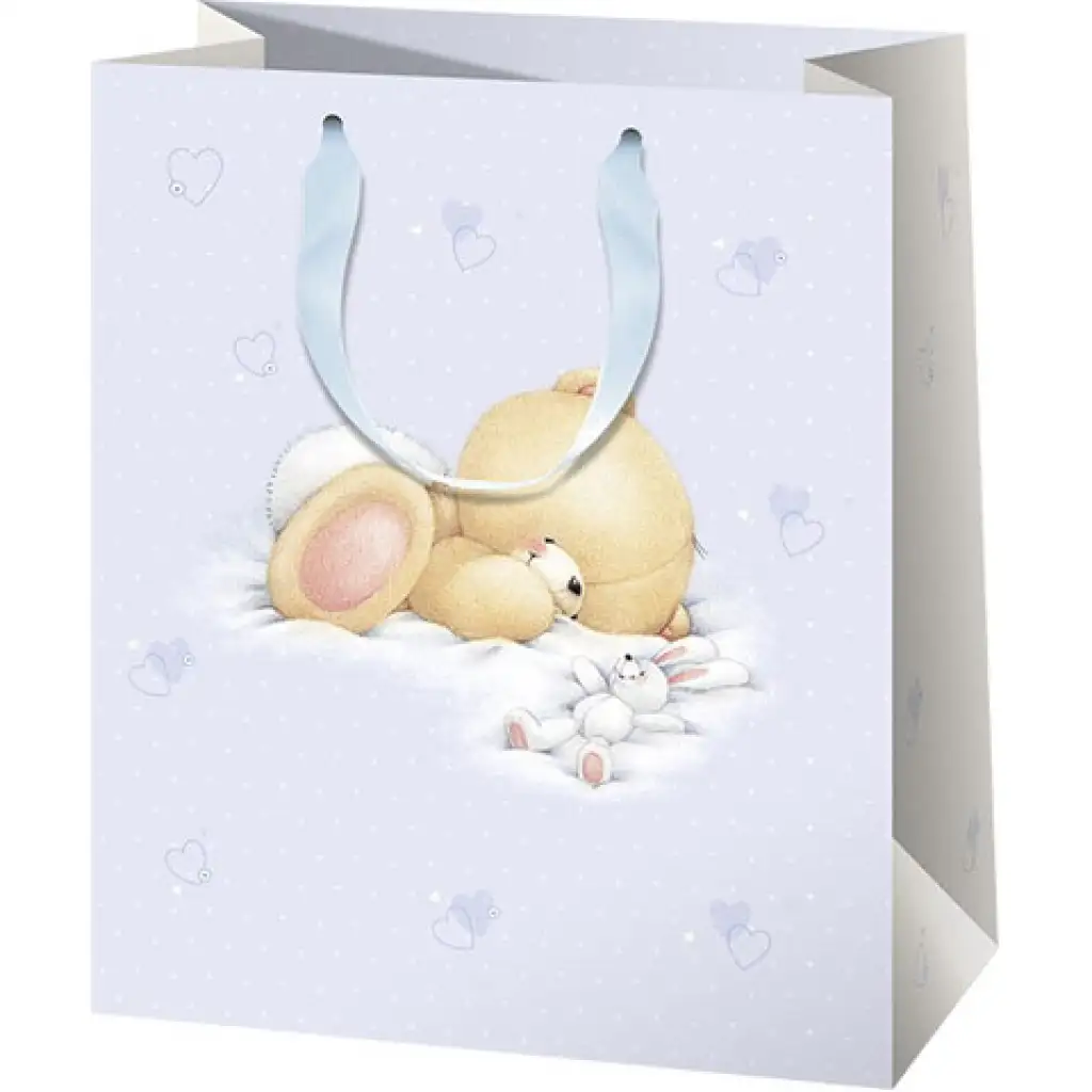Ezen a rendkívül dekoratív, halvány kék ajándéktáskán egy plüss maci és kis nyuszija láthatóak, amint épp a puha takarón pihennek. A kiváló minőségű és egyben igazán elegáns ajándéktáska kék szalagfüllel is ellátott, ami segíti annak és a benne rejlő meglepetésnek a kényelmes hordozását, így az ünnepelt egy stílusos kiegészítőben kapja azt meg. Szülinapokra, vagy akár babaváró bulira is tökéletes választás.