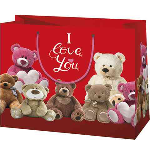 Piros alapszínén tökéletesen láthatóak a kedves plüss macik ezen az ajándéktáskán, melynek hangulata igazán barátságos és romantikus. A fehér "I Love You" felirattal is kiegészített ajándéktáskában több kisebb ajándék is várhatja az ünnepeltet, melynek átadása így dekoratív és praktikus formában történhet. A zsinórfülekkel is kiegészített macis ajándéktáska remek választás lányok számára, kortól függetlenül.