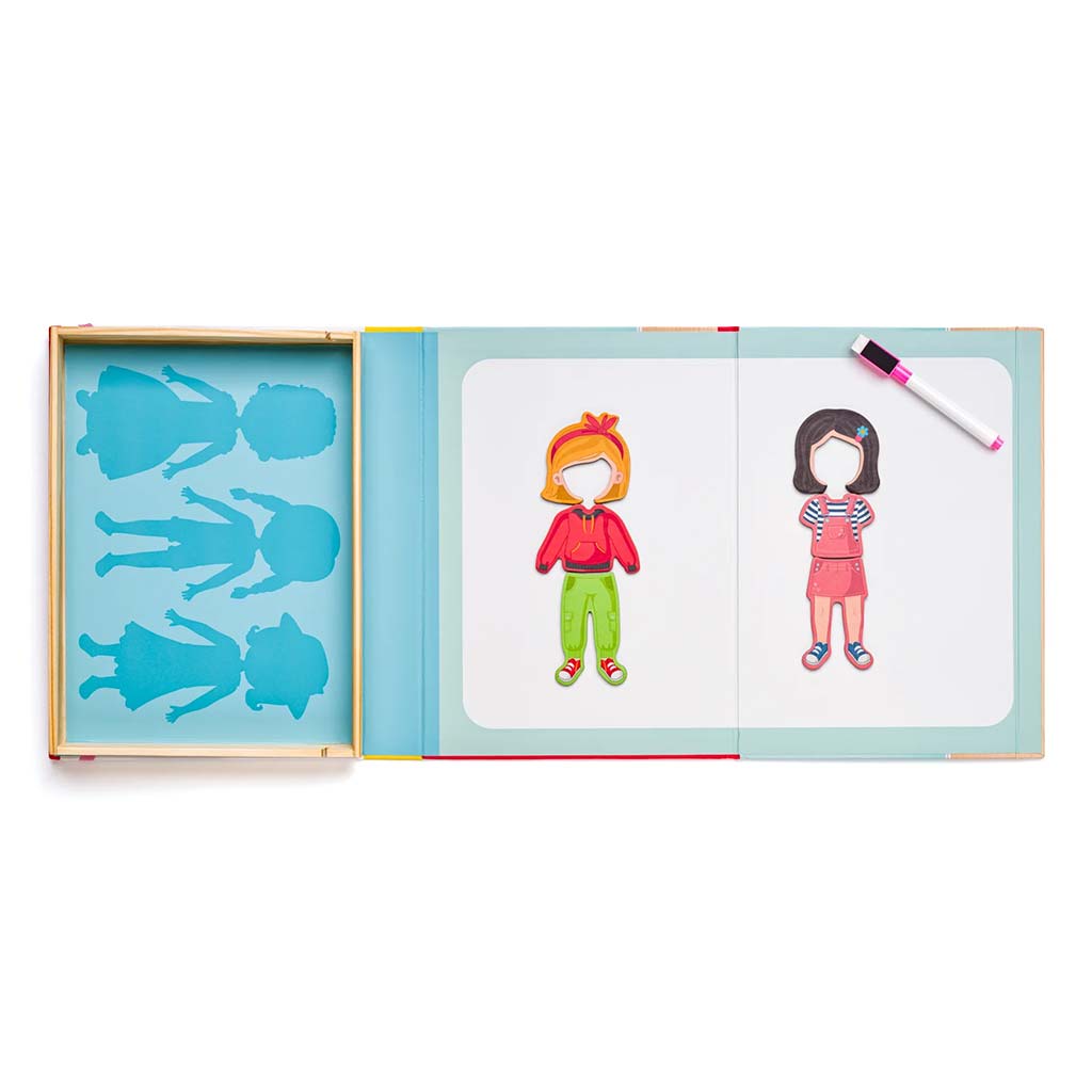 A könyv formájú, zárható doboz praktikus tárolást biztosít, így a ruhadarabok nem vesznek el, és utazáshoz is ideális. A belső mágneses tábla stabil alapot ad az alkotáshoz, a mellékelt letörölhető filccel pedig akár további részleteket is rajzolhattok a figurák köré. A játék fejleszti a finommotorikát, a kreativitást, az önkifejezést és a kombinációs készséget, miközben hosszú időre leköti gyermeked figyelmét.