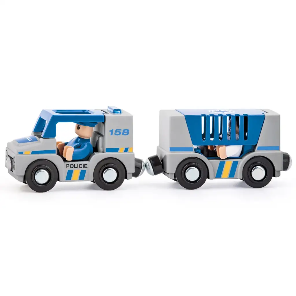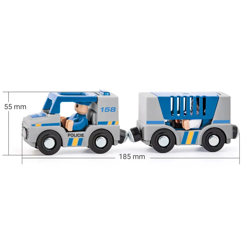 A járművek modern, valósághű rendőrségi dizájnt kaptak, a kék-szürke színösszeállítás és a részletes kidolgozás még élethűbbé teszi a játékot. Az autó vezetőfülkéjében egy kis rendőrfigura ül, míg a pótkocsiban egy rab található, akit a gyerekek elkaphatnak és elszállíthatnak a börtönbe. A figurák kivehetők, így még változatosabb szerepjátékokat lehet velük játszani.