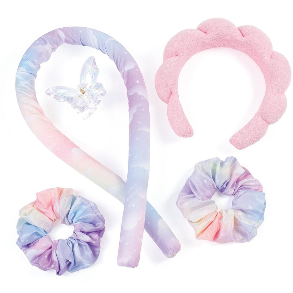 A készlet használata nagyon egyszerű: csak csavard a hajad a puha, pasztellszínű göndörítő rúdra, rögzítsd a pillangó alakú csattal, és már mehetsz is aludni. Reggelre a hajad hullámos, egészséges és csillogó lesz. A szettben található két szivárványos scrunchie és egy imádnivaló rózsaszín, puffos fejpánt is, így nemcsak göndör frizurát készíthetsz, hanem stílusos kiegészítőket is viselhetsz hozzájuk.