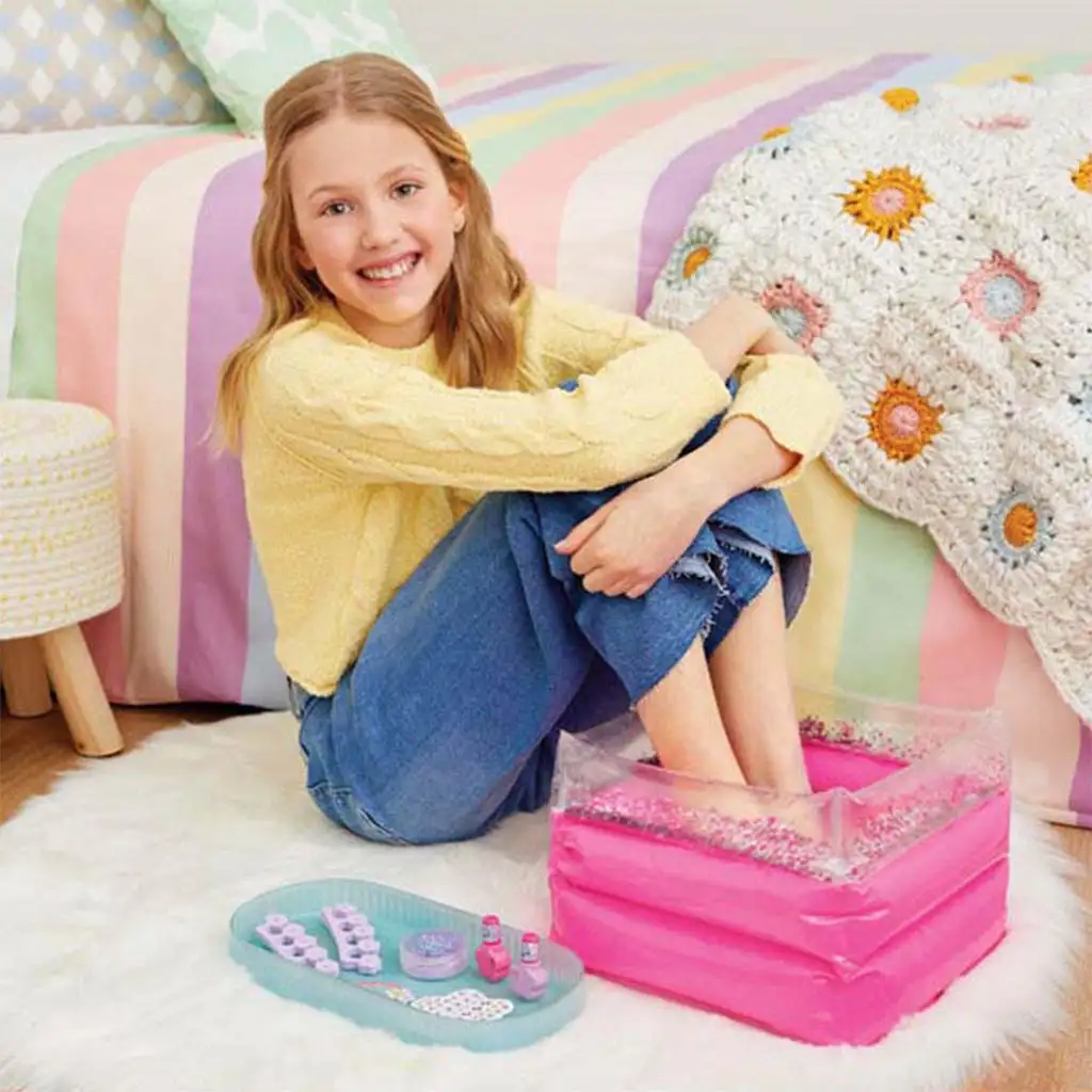 Merülj el a pihenés és az ápolás világában a Make It Real spa játékszettel! Ez a csomag mindent tartalmaz, amire csak szükséged lehet egy igazi lábápoló wellness nap elvégzéséhez otthon. A szett központi eleme egy felfújható wellness kád a lábaknak, melyben a fáradt lábakat egy kellemes, meleg fürdőben kényeztetheted. A kád nem csak praktikus, de nagyon is stílusos és hangulatos. A lábápolás elengedhetetlen részeként a csomagban két különböző árnyalatú körömlakkot is találsz, hogy lábujjaidnak is ragyogóan szép színt adj. A precíz lakkoláshoz két lábujj leválasztó is rendelkezésre áll, így az alkalmazás során nem lesznek elkenődések. A kreativitást és az egyediséget egy körömmatrica lap segítségével viheted tovább, amellyel a körmeid igazán különleges dekorációt kaphatnak. A tökéletes eredményért használd a körömreszelőt, hogy a körmeid formája precízen kialakítható legyen.