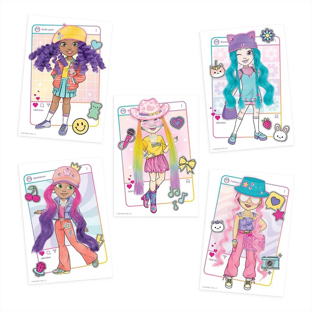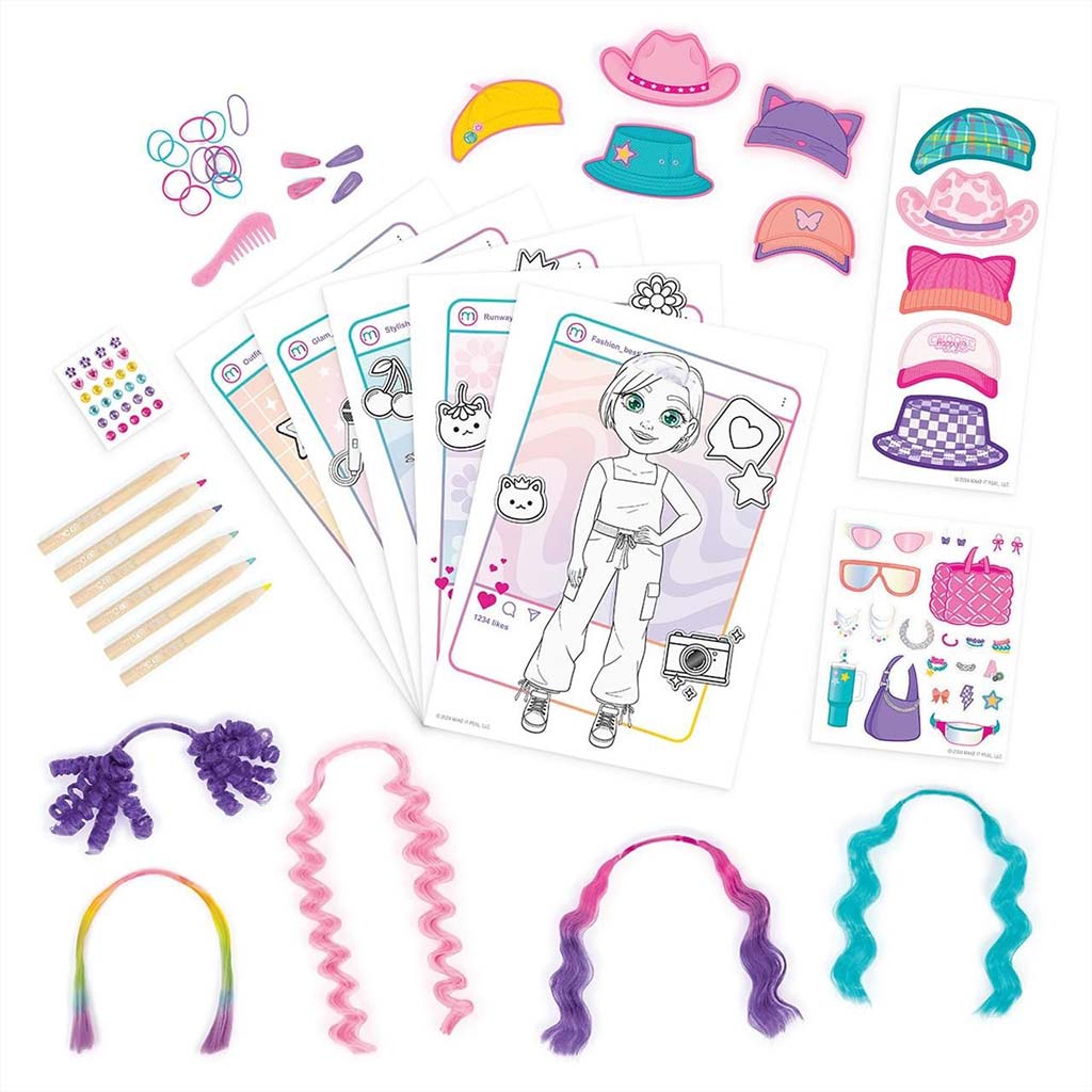 A készlet 5 különböző modell-lapot tartalmaz, amelyeket a mellékelt színes ceruzákkal, matricákkal és kiegészítőkkel lehet egyedivé tenni. Az igazán különleges élményt a csereberélhető színes hajtincsek adják, amelyeket a figurákra lehet illeszteni, így teljesen új frizurákat lehet kipróbálni. A kalapok, napszemüvegek, táskák és egyéb kiegészítők segítségével minden egyes alkotás más és más stílust kaphat – a sportostól a bohémig vagy akár az extravagánsig.