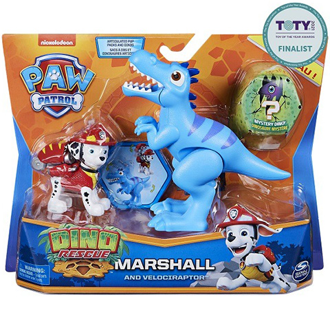 Marshall a kis dalmata kölyök ugyan néha kicsit ügyetlen, de az biztos, hogy bátorság dolgában nem kell szégyenkeznie, amit remekül mutat, hogy egy félelmetes velociraptor dinoszuruszt igyekszik megmenteni, és ebben a kalandban természetesen a gyerekek is csatlakozhatnak hozzá. A Mancs őrjárat Dino Rescue játékszettjei tartalmaznak egy a mese alapján részletgazdagon kidolgozott és festett kutya figurát és egy dinoszauruszt, aminek a segítségével a gyerekek felidézhetik a mesék legjobb pillanatait vagy akár új kalandokat is kitalálhatnak a kedvenceik részére.