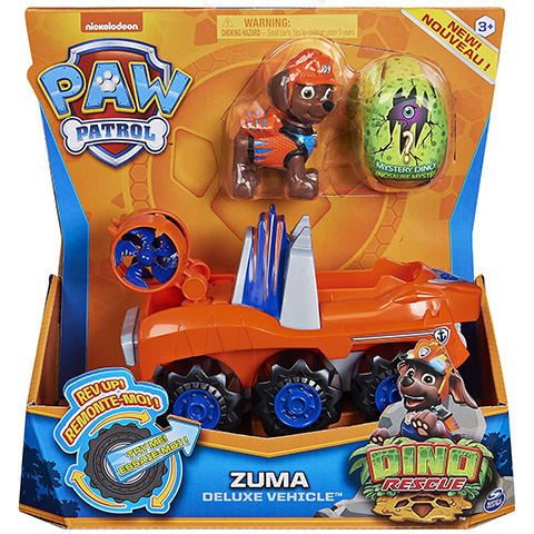 Zuma minden küldetés során maximális erőbedobással dolgozik, és ez természetesen arra a küldetésre is igaz, ahol a Mancs őrjárat tagja dinoszaurusz tojások után kutakodnak. A csomagban Zuma és a járgánya nem csak Zuma és a kedvenc járgánya, hanem egy titokzatos dinoszaurusz tojás is található. A részletgazdagon kidolgozott járgány épp olyan mint a mesében, ráadásul lendkerekes meghajtással teszi még izgalmasabbá a játékot a gyerekek számára. Természetesen a járgányba kényelmesen be lehet ültetni a kutya figurát, így a gyerekek felidézhetik a mese legjobb részeit vagy akár új történeteket találhatnak ki.