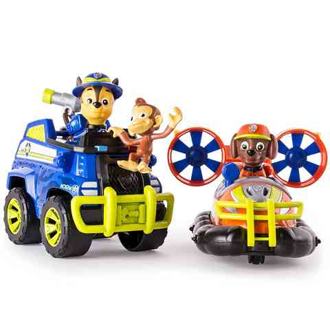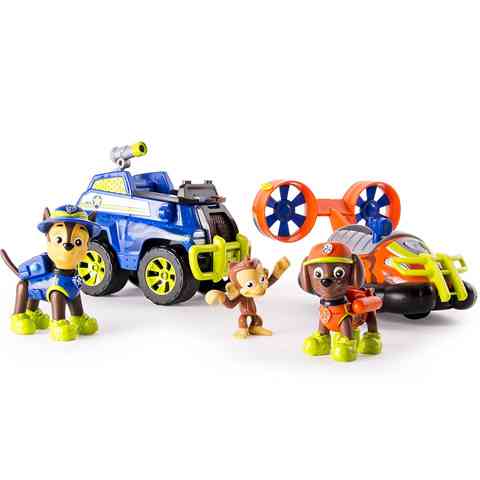 A Mancs őrjárat kutyusai nem csak a Kaland-öböl környékén teljesítenek szolgálatot, hanem a dzsungel mélyén is próbálnak rendet tartani és védeni a természetet. Ebben a csomagban két kis felfedezőt találsz. Zuma természetesen a saját légpárnás járgányával, így akár a folyókon és tavakon is képes közlekedni, míg Chase a terepjáró járgánnyal veszi nyakába az esőerdőt. Mind a kutyusok, mind a járgányok a mese alapján részletgazdag kidolgozással rendelkeznek, így a gyerekek felidézhetik a legizgalmasabb részeket, vagy új kalandokat találhatnak ki a kedvenceiknek.