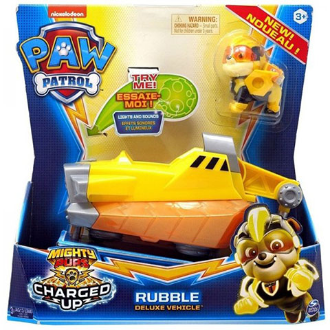 Rubble a kis buldog a Mancs őrjárat igazi építőmestere, aki midnig örömmel veti latba a saját és a munkagépei tudását, azonban ebben a csomagban egy igazi szuperhőshöz méltó jelmezben és a megfelelően vagány járgánnyal várja következő bevetését. A részletgazdagon kidolgozott járgány épp olyan mint a mesében, ráadásul fény és hang hatásokkal teszi még izgalmasabbá a játékot a gyerekek számára. Természetesen a járgányba kényelmesen be lehet ültetni a kutya figurát, így a gyerekek felidézhetik a mese legjobb részeit vagy akár új történeteket találhatnak ki.