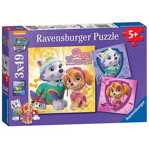 A Mancs őrjárat népszerű a kislányok körében is, köszönhetően Skyenak a spániel kutyusnak, és Everestnek a kis huskynak. Ebben a dobozban három különböző negyvenkilenc darabos puzzle is található, amelyeken pont ezek a kutyusok láthatók. A Ravensburger puzzle játékait élénk színek és lélegzetelállító képek képek jellemzik, az egyes elemeket pedig könnyedén össze lehet rakni és tökéletesen illeszkednek, köszönhetően a legkiválóbb alapanyagoknak és professzionális gyártási technológiának.