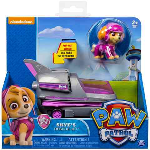 A bátor kis csapat legbájosabb tagja Skye, aki a kislányok kedvence lehet a Mancs Őrjárat meséből. A bátor kiskutya természetesen a csapat büszke tagja, aki most különleges járgányával érkezik a gyerekekhez. A mentő jet gombnyomásra nyíló szárnyakkal rendelkezik, valamint egy kampót is kihajthatnak a gyerekek az aljából amivel megkönnyíthető a mentőakció. A Skye játékfigura a járgányba ültethető.