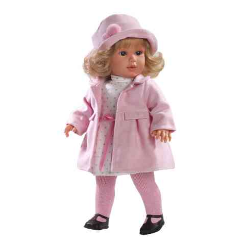 Az elegancia diszkrét bája tükröződik ezen a babán. Még Coco Chanel is rácsoldálkozna erre a csodás öltözékre. A rózsaszín kabát nőies, letisztult szabása, a kalap eleganciája olyan hatást kelt, mintha skatulyából húzták volna ki ezt a szépséget. A ruha pettyezése, a kalapon látható két pom-pom és a ruha derekán a szalag játékossá teszi látványt. A baba tekintetét kifejezőbbé teszik a hosszú, íves szempillák. Haja fésülhető. A baba ruházata és teste tisztítható, mivel könnyen kezelhető textil az anyaga. Végtagjai, feje és cipője gyermek barát műanyag.