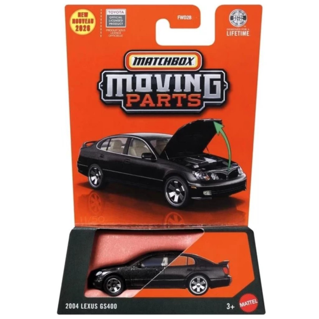 A Matchbox Moving Parts sorozat 2004-es Lexus GS400 modellje részletgazdag kidolgozásával és nyitható motorháztetőjével teszi még élethűbbé a játékélményt. A klasszikus fekete luxusszedán 1/64-es méretarányban készült, így tökéletesen illeszkedik a Matchbox gyűjteményekbe.