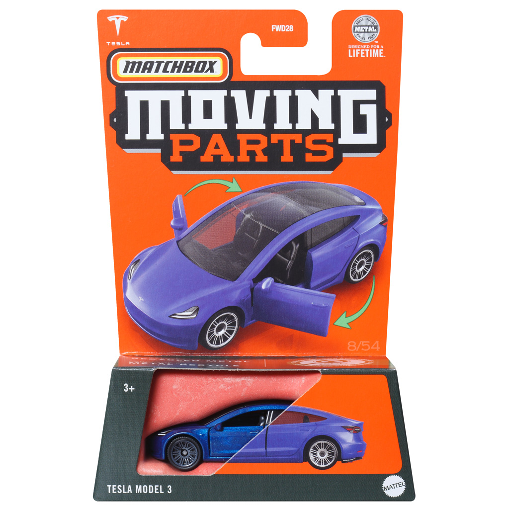 A Matchbox Moving Parts Tesla Model 3 egy fém autómodell, mely az igazi Tesla Model 3 autó stílusát és modern vonalvezetését örökíti meg. E modell kiemelkedő részletességgel készült, és nyitható elsőajtóival interaktív funkcióval gazdagítja az élményt, különösen a gyűjtők és az elektromobilitás szerelmesei számára.