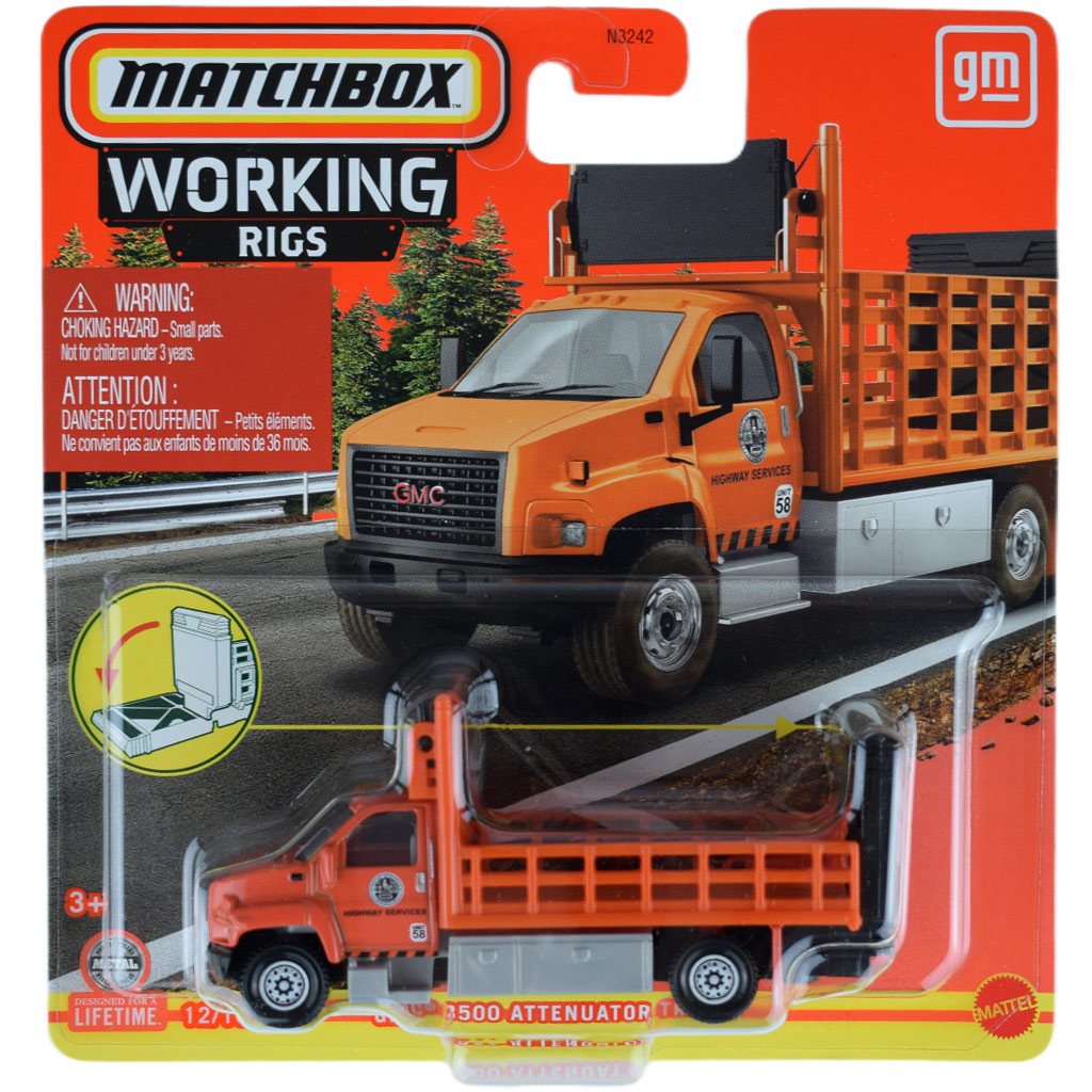 A narancssárga színben pompázó GMC 3500 Attenuator Truck kamion nyitható rámpával és forgatható jelzőtáblával a tetején rendelkezik. Ez a részletesség és interaktivitás teszi egyedivé ezt a Matchbox járművet. A nyitható rámpa és a mozgatható jelzőtábla lehetővé teszi a gyerekek számára, hogy valósághűen szimulálják a munkafolyamatokat és kreatívan játszhassanak.
